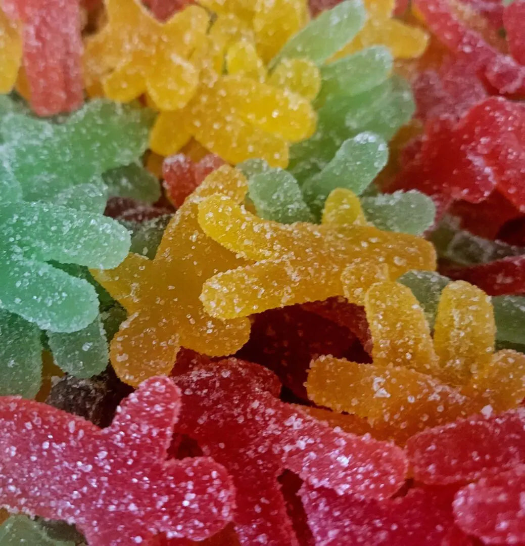 Ingredients: Sugar, glucose/fructosesyrup, water, gelatine, acidity regulator (malic acid), flavour, colours (E100, E120, E133/ 160a).
