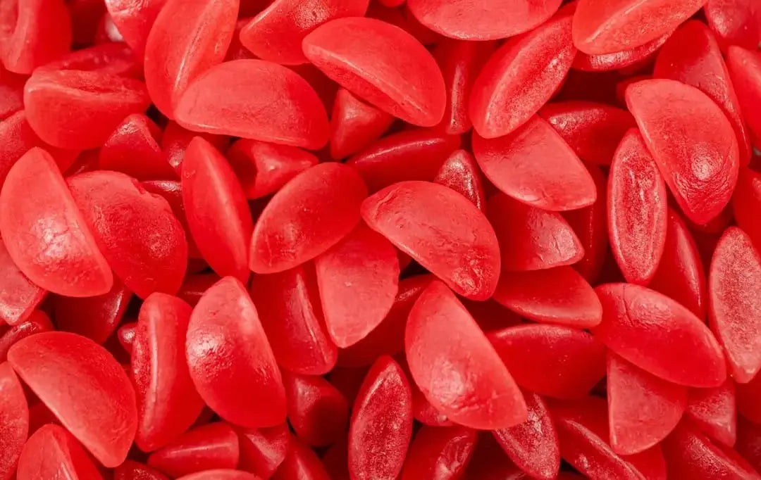Ingredients: Sugar, glucose syrup, gelatin, acidity regulator (citric acid), flavorings, vegetable oil, glazing agents (carnauba wax). Color: carmine.