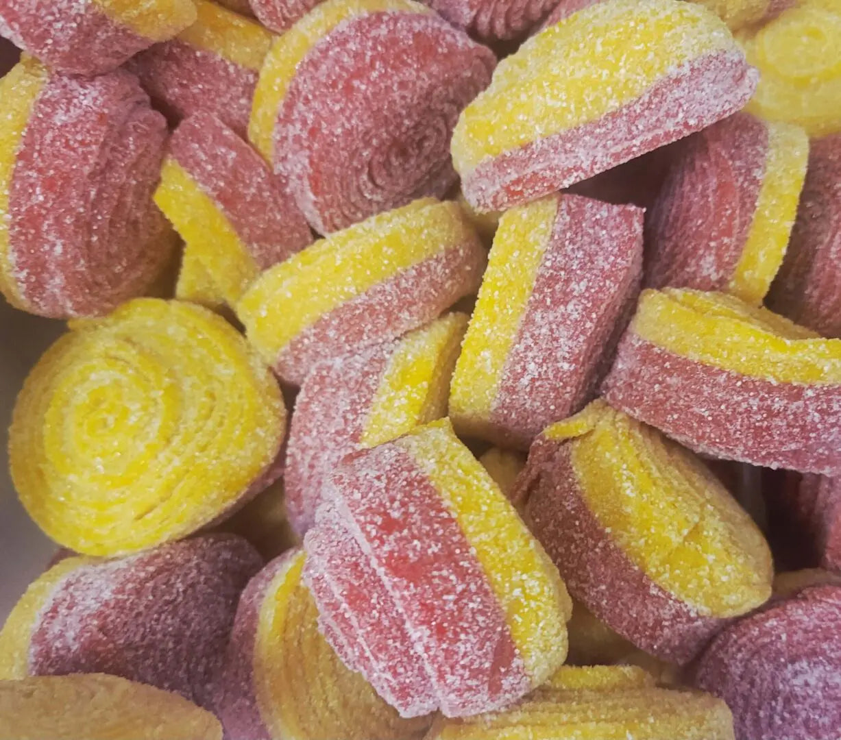 Sour sugar-coated strawberry and lemon rolls.