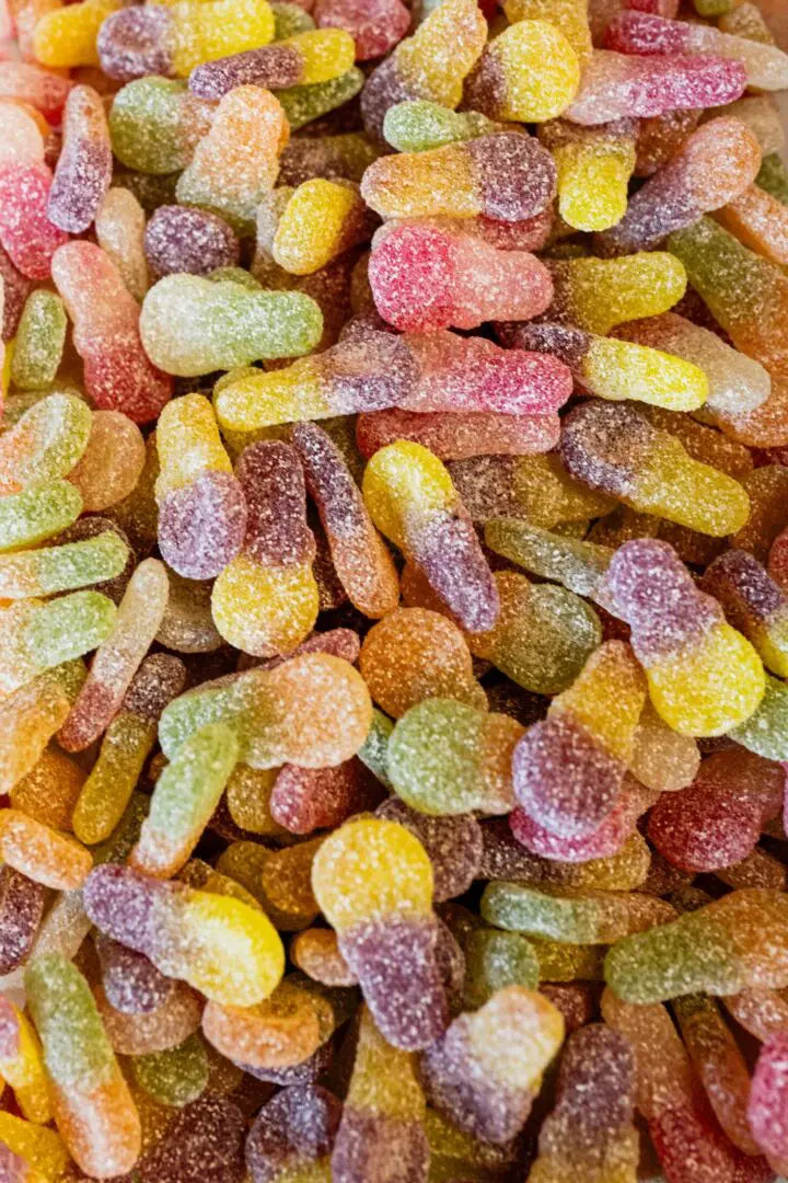 sugar, glucose syrup, maize starch, water, acids: (E260, E270, E296); gelling agent: pectin; concentrated fruit juice (apple, grape, pear), flavorings, elderberry concentrate, nettle extract, spinach extract, colors: (E100, E160c).