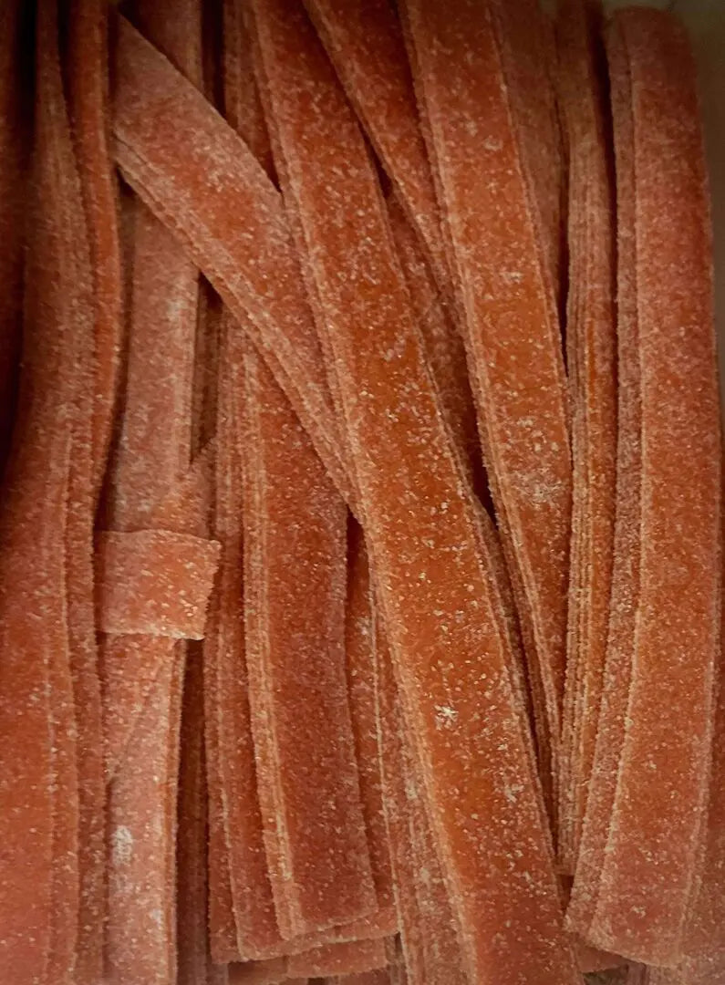 Strawberry flavored gummy belts with a sour sugar coating.